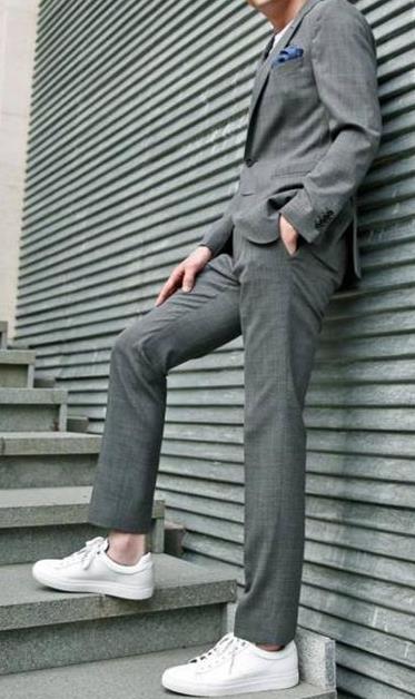 大家還需要注意,在穿西裝搭配運動鞋的時候,不要搭配高幫的運動鞋。畢竟西裝褲的材質、版型等方面和運動褲存在很大差別,如果穿了高幫運動鞋,你的西裝褲就會和鞋子纏在一起,會顯得腿短。