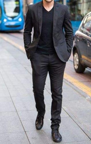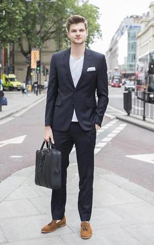 如果穿的是純黑色的西裝,或者是黑色條紋的西裝,腳下可以搭配一雙咖啡色的系帶休閑鞋。如果穿了黑色西裝之后又穿一雙白色的運動鞋的話,給人帶來的顏色沖擊比較大,而且看上去會很死板,所以建議大家搭配深咖色的運動鞋。
